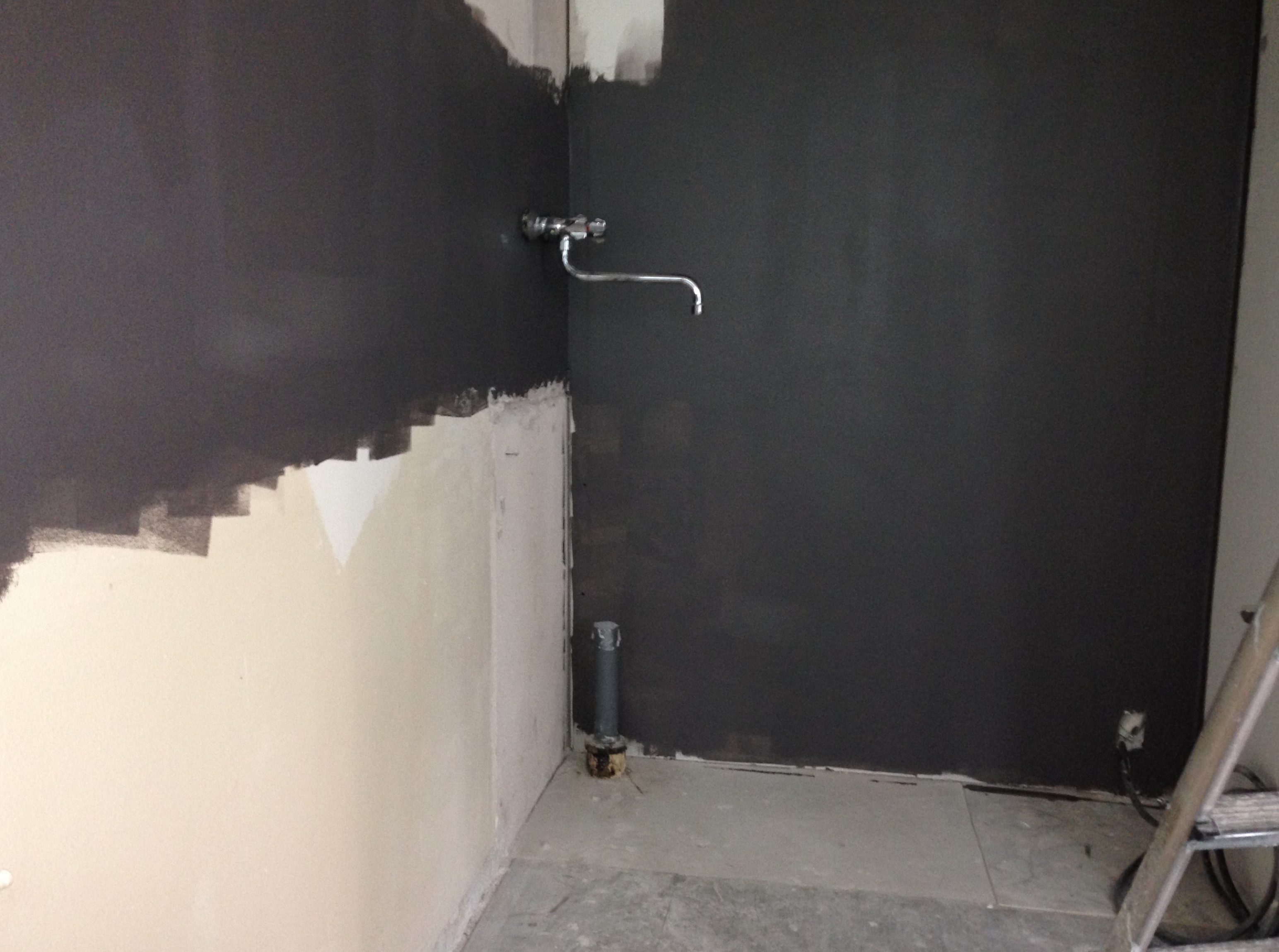 Keittokomeron maalaus odottaa kalusteasennuksia. Kalusteiden taakse jääviä pintoja ei maalattu.