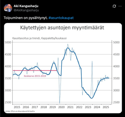 Graafi, josta puhuttiin. Tuore Kiinteistövälitysalan Keskusliiton katsaus, jota odotettiin. Isoin selitys pohditulle kappalemääräerolle oletetaan löytyvän siitä, että KVKL:n luvuissa on mukana omakotitalot (kiinteistöjä).