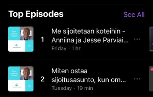 Tämä on 6. Ostan Asuntoja Tiistaiaudio. Jokainen näistä kuudesta on noussut Apple Podcastsin Business -kategoriassa kuuntelutilastossa sijalle 1. Positiivista palautetta on tullut runsaasti. Kiitos kaikille! Palautteen perusteella kokeilu jatkuu.