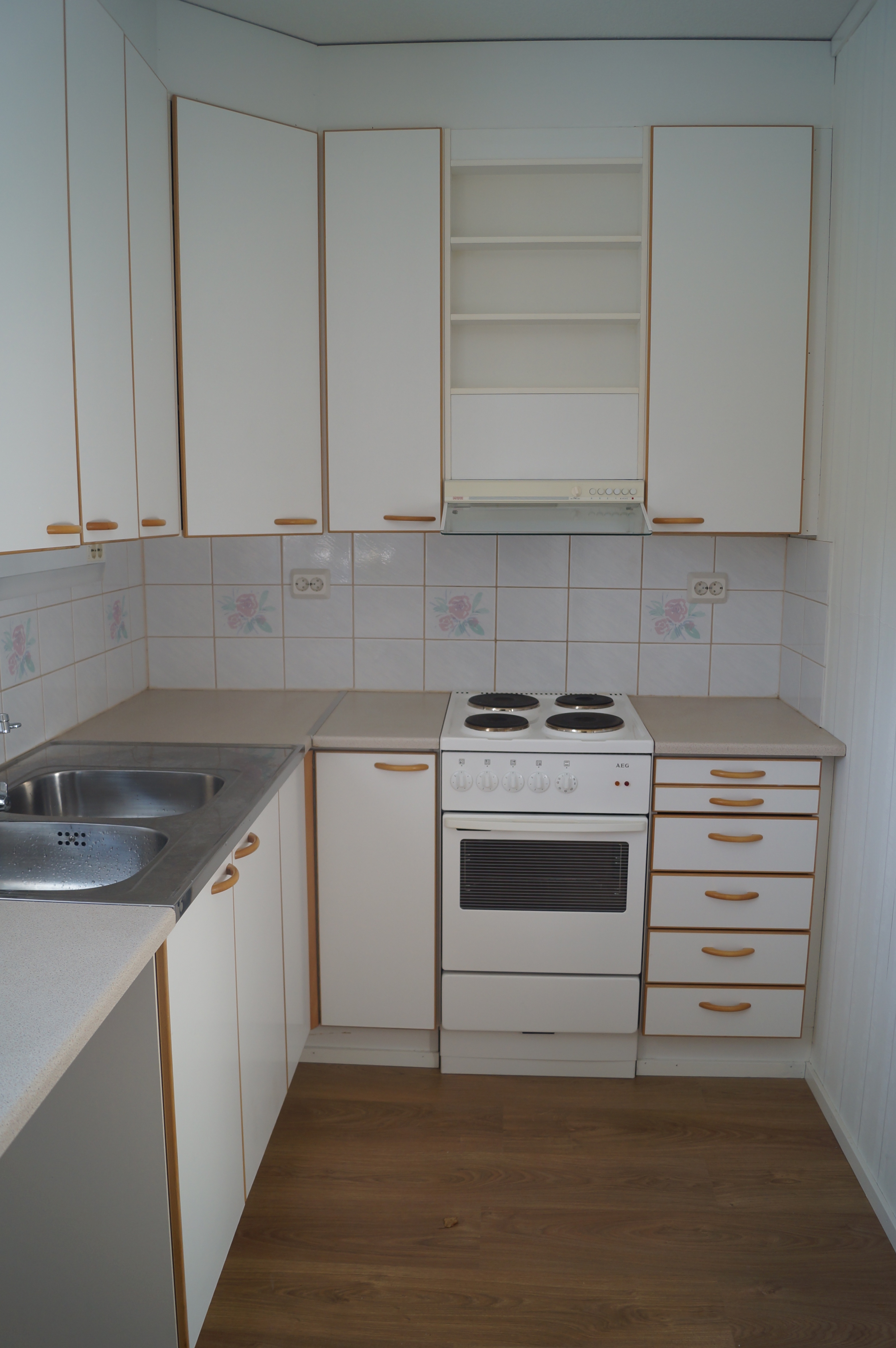 Keittokomerossa hyvin tilaa. Vasemmalla ikkunan edessä oleva alhaalta avoin pöytätaso, jonka jälkeen jää-/pakastekaappi ja siivouskomero.